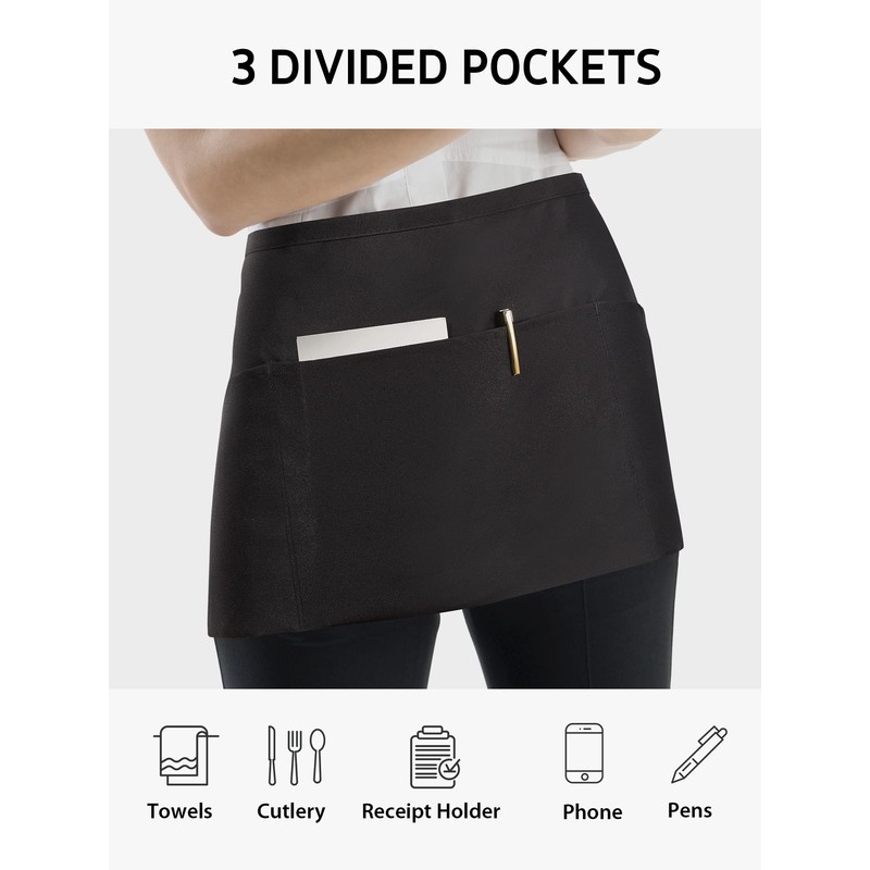 - 3 Pack - Set includes 3 waist aprons in black. Convenient to change and wash.