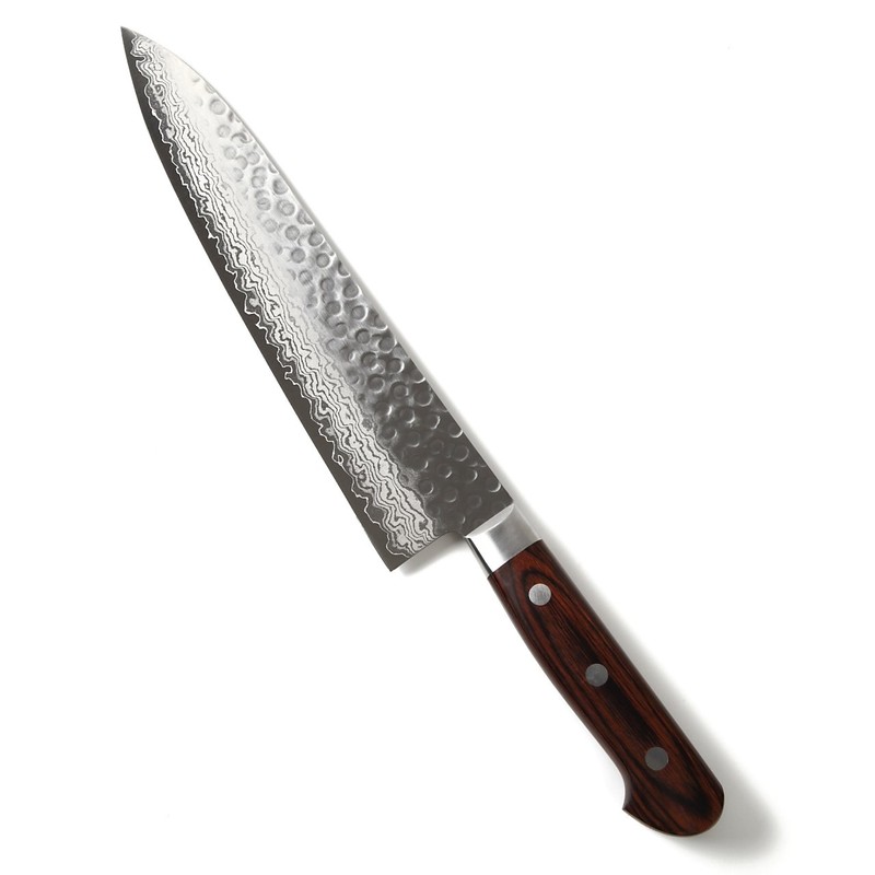 - ''' MASTER CRAFTSMANSHIP - Handcrafted in Sakai Japan, where more than 90% of Japanese professional chef knives are produced. It is produced one at a time manually by highly skilled master artisans. It outperforms industrially mass produced products from every aspect. The master craftsmanship shines through in every single product. The unparalleled performances make you feel standing at the pinnacle of cooking! Sheath is sold separately.#||# RAZOR SHARPNESS - Ready to use out of the box with ruthless sharpness. The core is Takefu VG-10 high carbon stainless steel (HRC 60-62) produced in Fukui Japan. Combined with 16 layer clad Damascus construction, it gives exceptional sharpness, edge retention, durability, and ease of sharpening at the same time. You can easily feel your upgraded technique level just by using a Syosaku Gyutou (Chef’s) Knife. Hand wash only and regularly sharpen on quality whetstones.#||# VERSATILITY - Ideal for everyday chef handling daily kitchen tasks, whether professional or nonprofessional. You can cut, dice, slice, mince and chop with one knife. You can cut meats, fish, vegetables, fruits, and more. You can use it as a sushi knife, too. It’s double-edged, so doesn’t matter if you are right handed or left handed. To avoid a chip in a blade, don’t chop hard stuff like bones, nutshells, and frozen foods. Do not use on granite countertops.#||# DURABILITY AND EASE OF USE - Both the VG-10 core and outer damascus steel are stain & corrosion resistant. The premium Mahogany wood used for the handle is water-repellent and non-slip. You don’t have to worry when it is left wet during its use (recommended to wash and dry after the use). The handle is triple riveted to the full tang, which gives exceptional strength & durability. The ergonomically designed handle and perfectly balanced construction make you comfortable even for a long time use.#||# AESTHETICS AND 100% SATISFACTION GUARANTEE - An exquisite outer steel not only eliminates friction and keeps food from sticking to the blade, but also the beauty makes your cooking more enjoyable. An elegant Mahogany handle adds more visual accents. It brings refinement and style to any modern kitchen. Impress your guests with the stunning beauty. It’s a perfect gift for your loved one, too. If you don't love our Syosaku Chef Knife, please return within 30 days of purchase for a full refund.'''