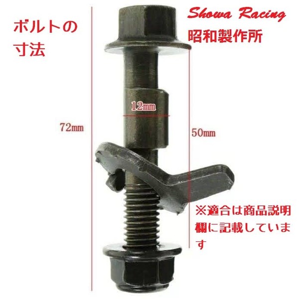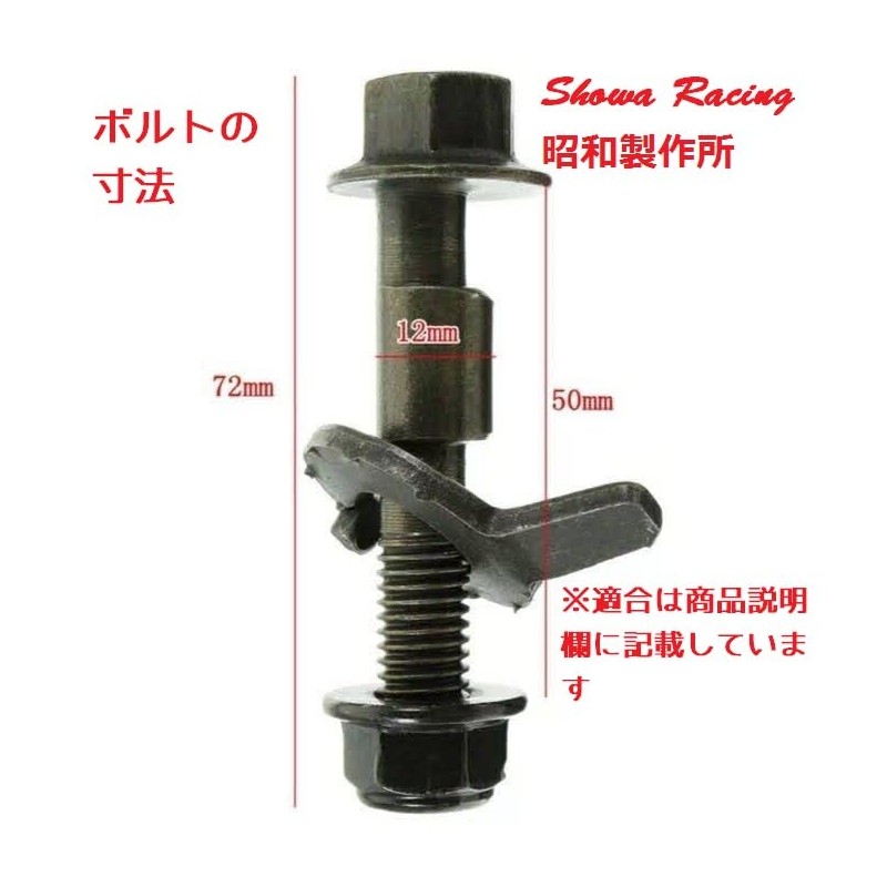 Product Contents: 2 bolts x 2 dedicated cam washers x 2 loose nuts x 2 Size: M12 bolt length x 2.4 inches (60 mm) Camber adjustment angle approx. -1.75° to approx. 1.75° Material: Galvanized steel How to use: Replace shock absorber and knuckle bolts with strut type suspension. You can adjust the camber angle by replacing it. Changes between positive camber or negative camber can be changed either by attaching the washer nail to the suspension side or attaching to the knuckle side. Confirmed Fitment for Daihatsu: Atrey, Wake, Essex, Ku, Cast, Copen, Sonica, Tanto, Hygette Cargo, Boon, Mira, Move Honda: N-ONE, N Box, N Wagon, S660 (JW5), Zest, Fit (GD Series), Life Mazda: MPV, Demio, Family, Primacy Mitsubishi: eK Cross. /eK sport/eK Wagon, i, Colt, Town Box, Mirage, Diamante, EK Series Nissan: Avenille, Cube, Note, Pulsar, March (K12), Moko, Lux Opel: Vita, Vectra, Omega Renault: Twingo Daihats: Mira, Esse, Copen, Boon, Tufting, Rocky, Naked Wake... All Car Suzuki : MR Wagon, Wagon R, Alto, Every, Swift, Hustler, Rapan, and all other vehicles Subaru R1, R2, Travic, Preo VW: Golf II/III (~1998), Polo Volvo: 850, C70, V40 Alpha Romeo: MITO Fiat500, 50X. Panda, GR. ANDE PUNTO