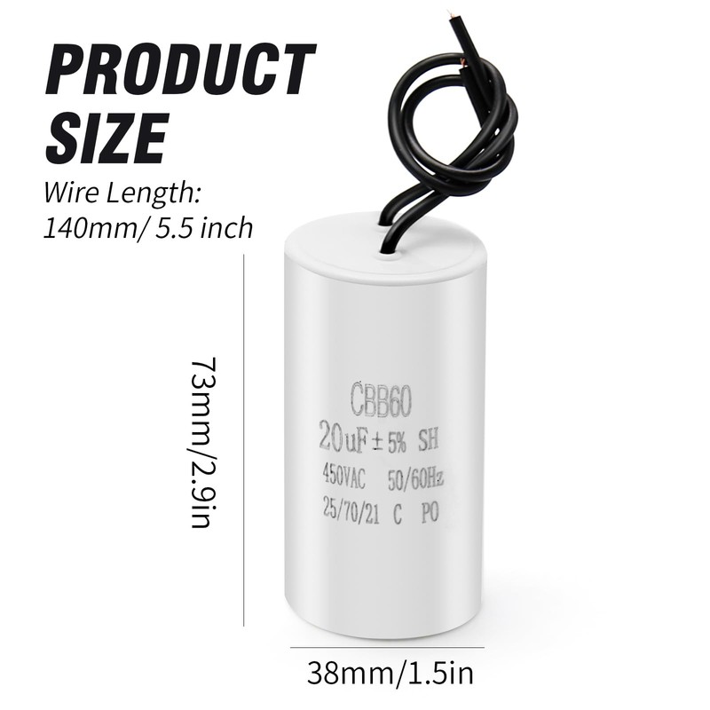 - Specification: Material: Polypropylene Film; Rated Capacitance: 20uF; Tolerance: 5 %; Rated Frequency: 50/60 Hz; Ambient Temperature: 40/70/21;Body Size: 4x 7.5cm / 1.58"x 2.91" (D * H); Cable Length: 15mm / 0.59"