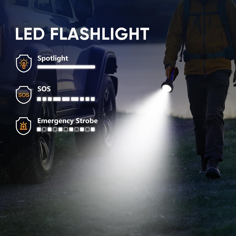 • 【Multi-Function Survival Flashlight】400-lumen extended runtime, one-touch lighting/Strobe/SOS modes, instant support during outdoor power failures
