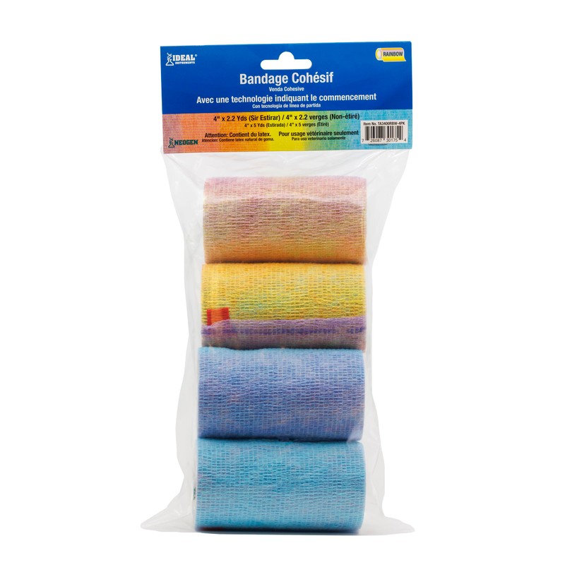 - Alternating bright color bands provide a unique, visually pleasing rainbow effect when the cohesive horse bandage is applied