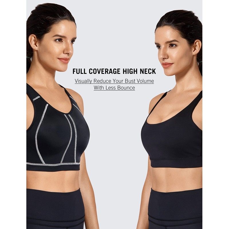 - NO BOUNCE: Racerback with hook and eye for bounce control and keeping in place. Size to G cup, high impact perfect for large breasts
