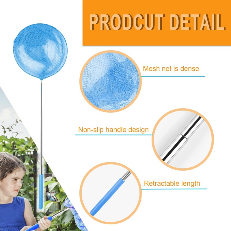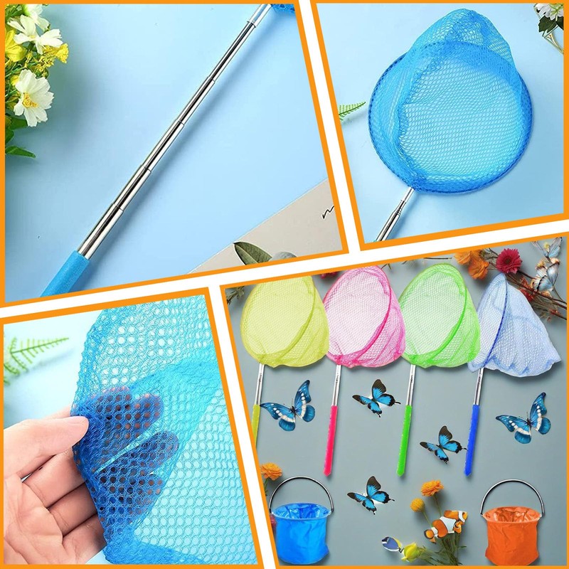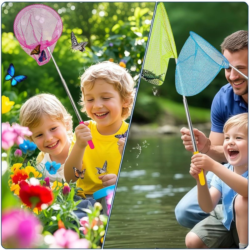 - Telescopic Design Set:This 6 piece kids fishing net set includes four 85 cm long fishing nets in pink, blue, yellow, and green, along with a blue bucket and an orange bucket. The fishing nets for kids feature a telescopic function, easily adjusting from a compact size to reach out for catching fish, shrimp, butterflies, or dragonflies.