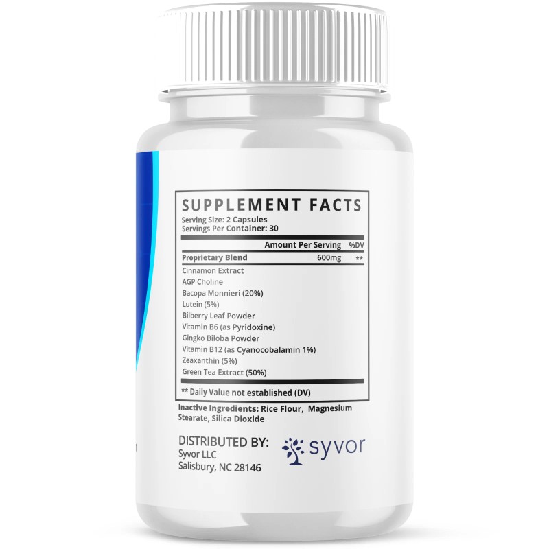 Brahmi (Bacopa monnieri), Ginkgo (Ginkgo biloba), Lutein, Vitamin B12, Vitamin B6, Zeaxanthin, Cinnamon Extract, AGP Choline, Bilberry Leaf Powder, Green Tea Extract