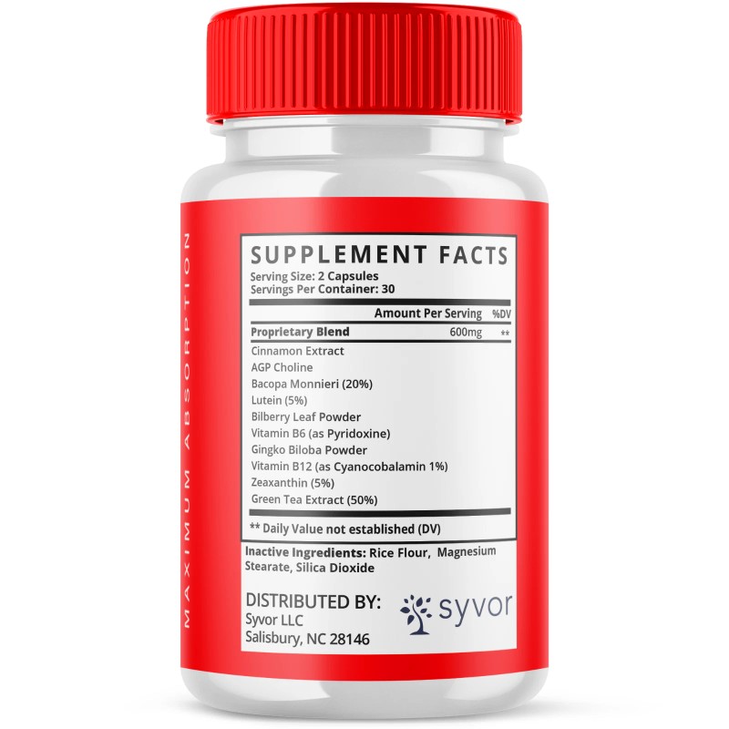 - Active Ingredients: Bilberry (Vaccinium myrtillus), Brahmi (Bacopa monnieri), Lutein, Vitamin B12, Vitamin B6, Zeaxanthin, cinnamon extract, AGP choline, Gingko Biloba, Green Tea Extract