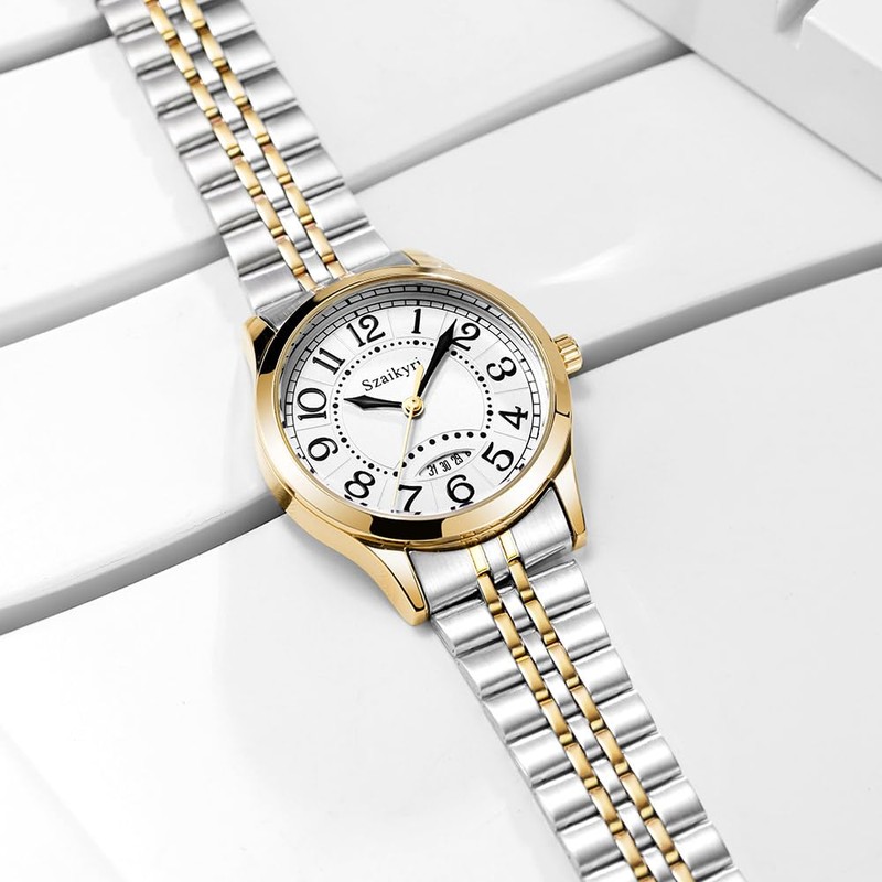 Szaikyri Classic Watch for Women with Easy Read Time Arabic Numerals Ladies Watch with Calendar Water Resistant (Silver-Gold Black)