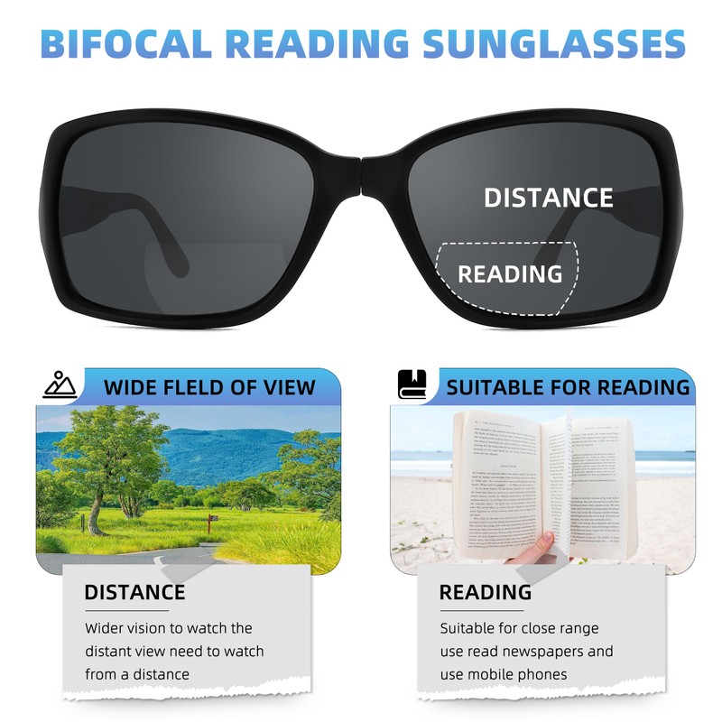 - Bifocal Vision & UV400 Protection - Switch seamlessly between near and far vision with almost invisible bifocal lenses, while the UV400 coating blocks 100% of UVA/UVB rays - for clear vision and eye safety outdoors.