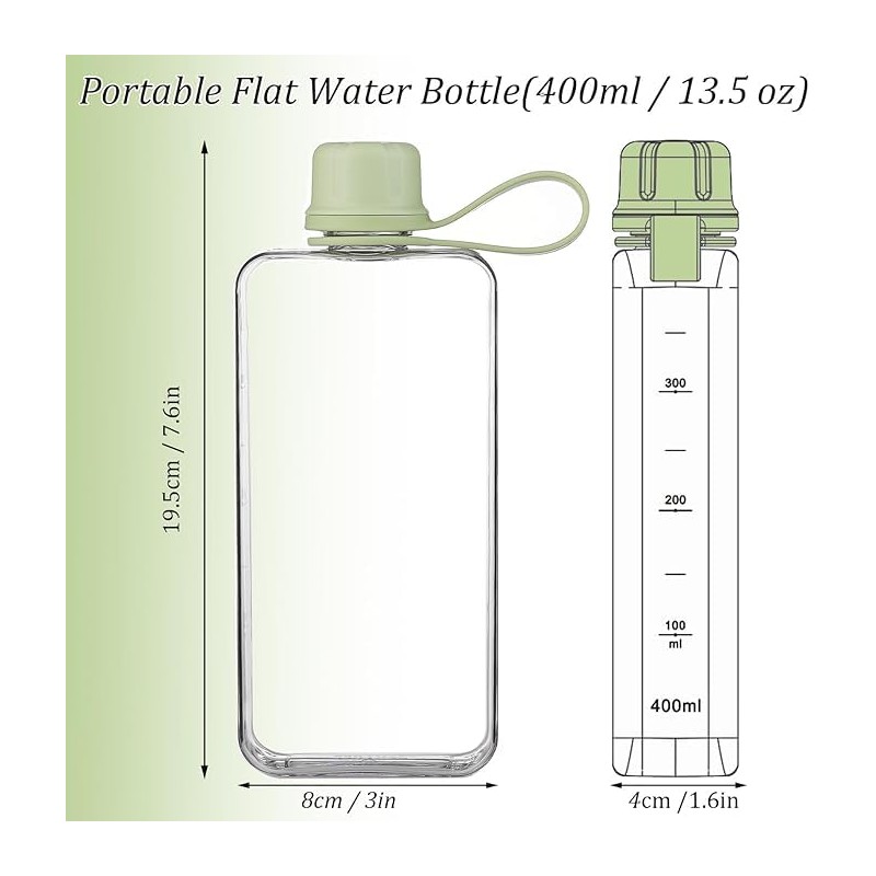 SZHENGSHAN 1Pc Slim Square Travel Water Bottle, 400ml, Green, Reusable, Square, Leak Proof, Plastic, 8cm x 19.5cm, Hand Wash Only, Travel, Outdoor Activities, Everyday Use