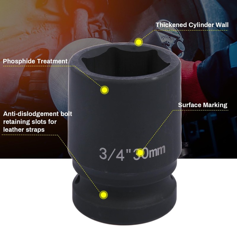 - 【SIZE - DRIVE】3/4" 6-point socket size:30mm, total length 56mm. The specifications are clearly marked on the surface of the socket, which is easy to identify and improves work efficiency.