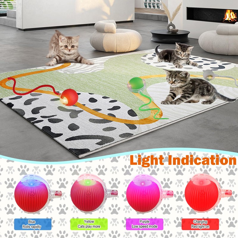 - 【𝟑 𝐦𝐨𝐝𝐞𝐬】The cat toys for indoor cats adult can switch modes with just one button, blue flashing light represents the fast mode, the ball speed is faster, to meet the pet's pursuit of speed; yellow flashing light is the interactive mode, the movement trajectory is more flexible and changeable, to enhance the interactivity with the pet; violet flashing light is the slow mode, suitable for less sensitive or timid cats to play.