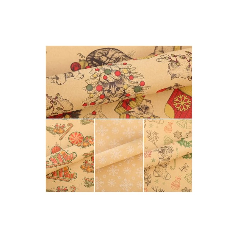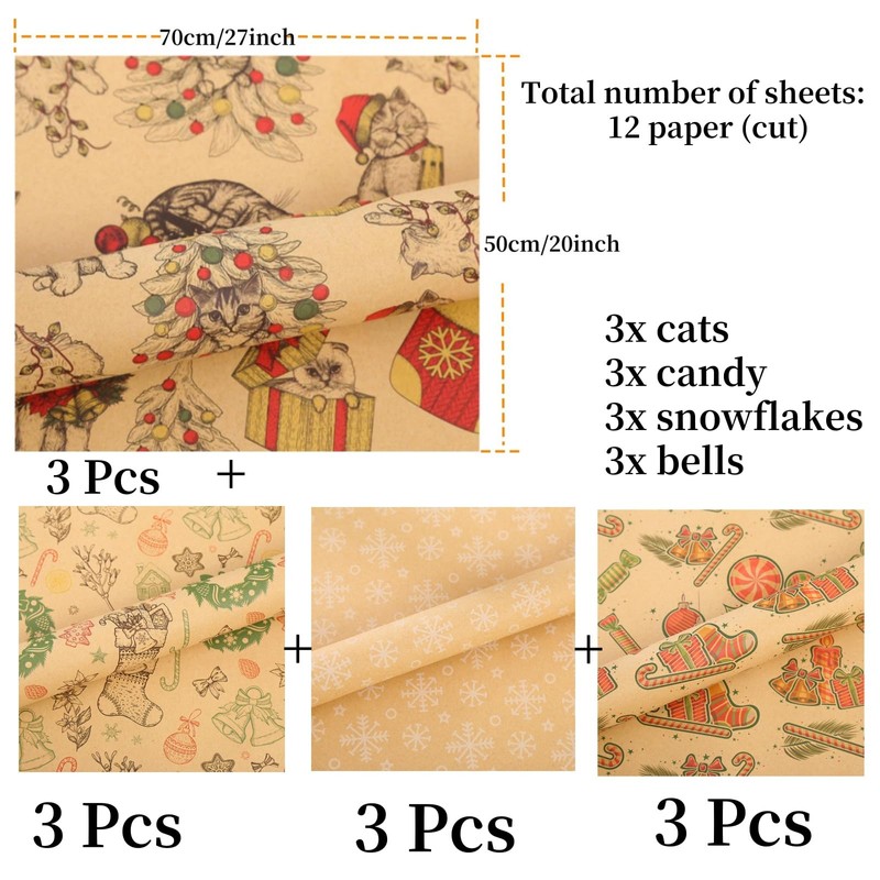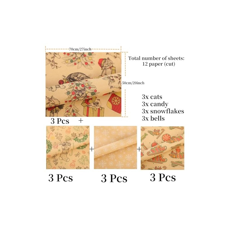 - Versatile Wrapping Paper: This set includes 12 sheets of kraft wrapping paper in 4 festive Christmas patterns - cats, candy, snowflakes, and bells.