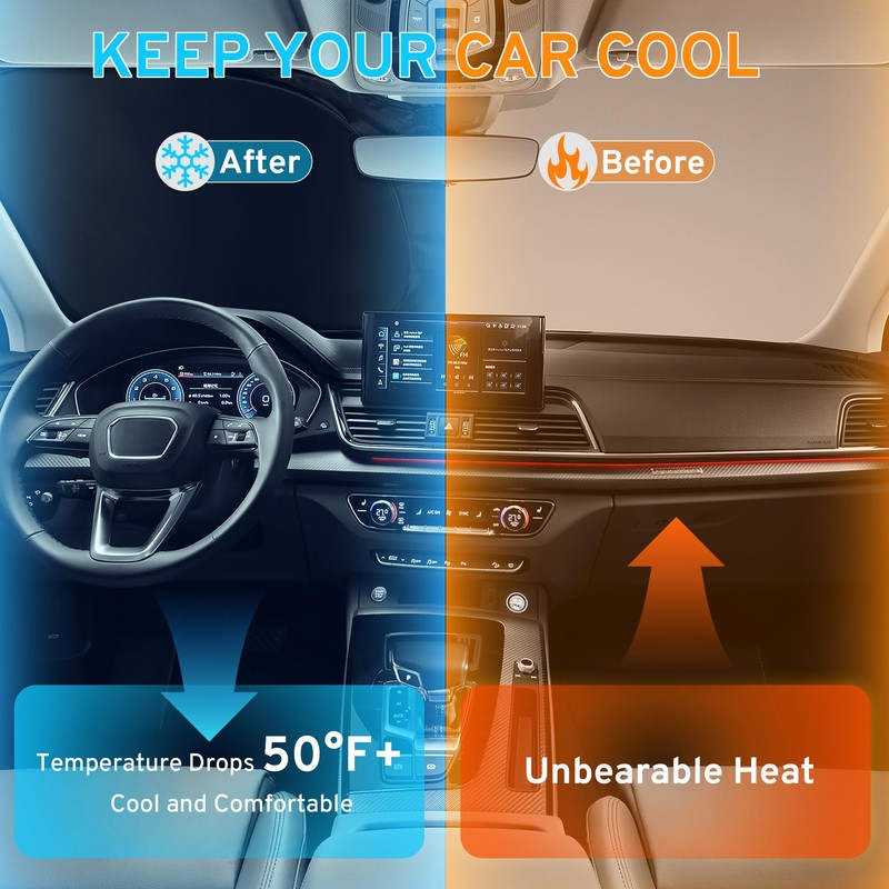 • 【Double Layer Sunshade】: The windshield sun shield for Mazda CX-50 is made of a double layer of heat shield fabric to keep out the sun. The first layer is premium 240T reflective polyester, the second layer is high-quality fabric. It provides double insulation and protection.