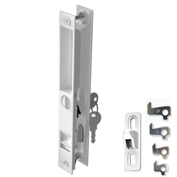 T-HAKEN Sliding Glass Door Handle Set | 6‑5/8″ Hole‑Center, Flush‑Mount Hook Style, Non‑Handed, Fits 1″–1 1/8″ Thick Doors – Keyed (White)