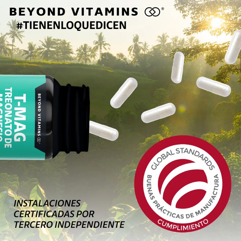 - MAG Treonato Magnesio Beyond Vitamins: Libre de azúcares, lácteos y soya Libre de edulcorantes, colorantes, saborizantes, ingredientes artificiales ni conservantes No contiene hormonas No contiene antibióticos MODO DE EMPLEO Tomar dos (2) cápsulas al día, preferiblemente junto con alimentos (idealmente con grasas saludables, tales como aguacate, nueces, semillas o aceites de oliva o vegetales) y agua. No exceder la porción recomendada. PRECAUCIONES: No se recomienda su uso en menores de 18 años, Manténgase fuera del alcance de los niños. Conservar en un lugar fresco y seco. No consumir si el sello ha sido violado. Consumir antes de la fecha de expiración. El consumo de este producto es responsabilidad de quién lo recomienda y de quién lo usa. RESTRICCIONES DE USO: No se recomienda el uso de este producto durante el embarazo y lactancia. Si se encuentra bajo tratamiento médico, presenta una condición médica o se encuentra próximo a un procedimiento quirúrgico, consultar un especialista antes de su consumo. En caso de generar alergia a algunos de sus componentes, suspenda su uso. Aviso legal