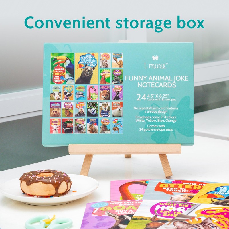 - ALL-IN-ONE BULK SET - We've made sure you've got everything you need to easily stay connected with loved ones! This assorted pack of Animal Joke Notecards includes 24 unique cards, each made with quality cardstock, paired with colorful water-activated glue envelopes in Blue, Yellow, White, and Orange, plus gold envelope seals. Everything is neatly packed in a protective storage box to keep your cards in great condition, so you're always ready for any occasion!
