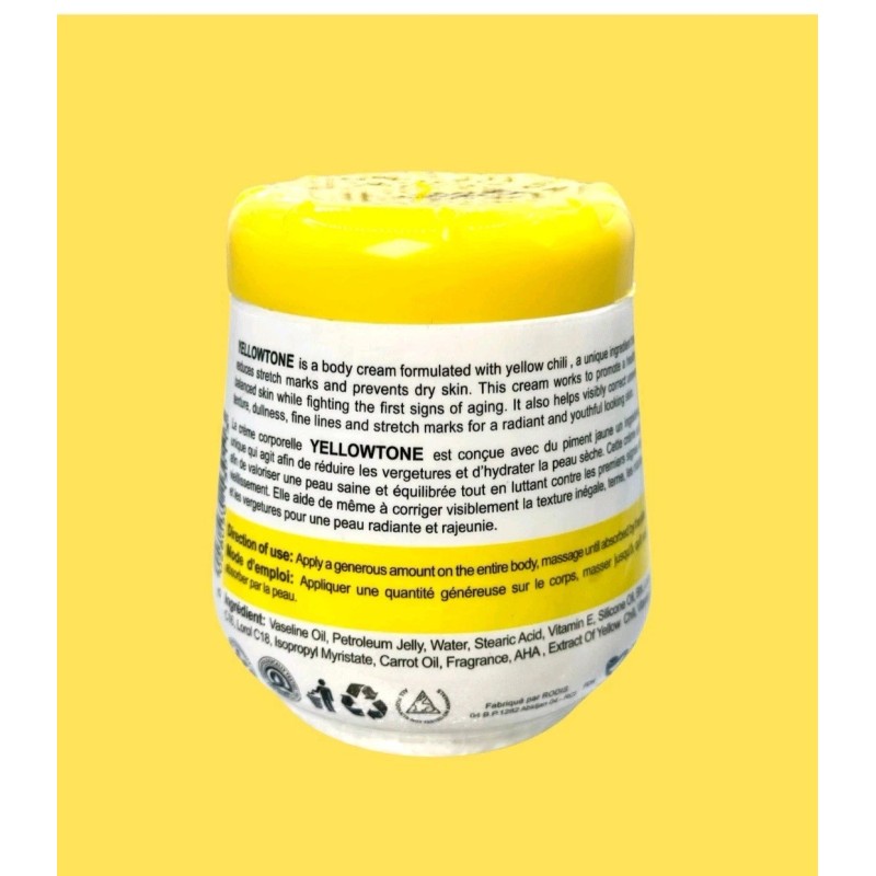 The Yellow Tone Cream by T-ONE is a daily use cream specifically formulated to target dark spots on the face and full body. With a period after opening of 12 months, this cream contains all-natural ingredients such as glycerin to help brighten and even out skin tone. The product comes in a pack of 4, making it a convenient and effective option for anyone looking to improve the appearance of their skin.