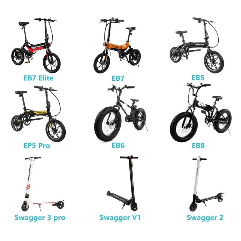 - Swagtron Cali Drift 3-Wheel, Swagger 3 SG-3 SG3 Pro Foldable Electric Scooter E-Scooter 250W Motor SG-6 SWGR6-2-F Swagtron EB12 eBike 36V 7.5 Ah Li-ion Electric City Commuter Bike EB-12 , Swagtron EB11 eBike 36V 7.5Ah Electric Cruiser Bicycle Bike EB-11 , Swagtron EB10 eBike 36V Step Through Cruiser Bike EB-10