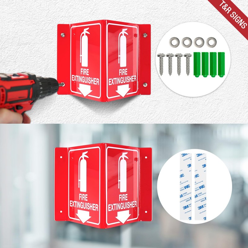 - Includes: Each package includes 4 pcs of Fire Extinguisher Signs, eight double-sided tapes and matching screws and expansion tubes.