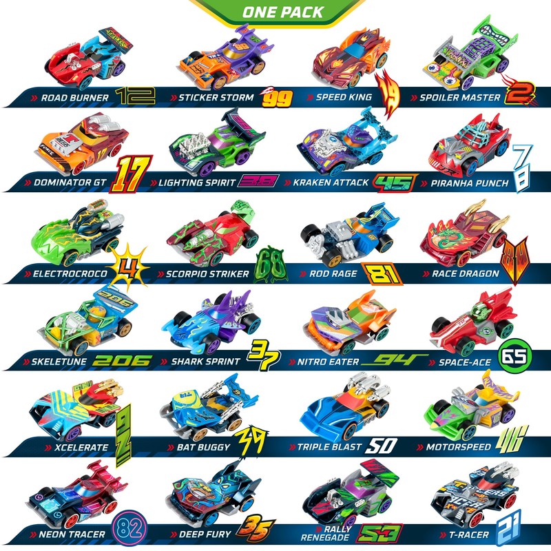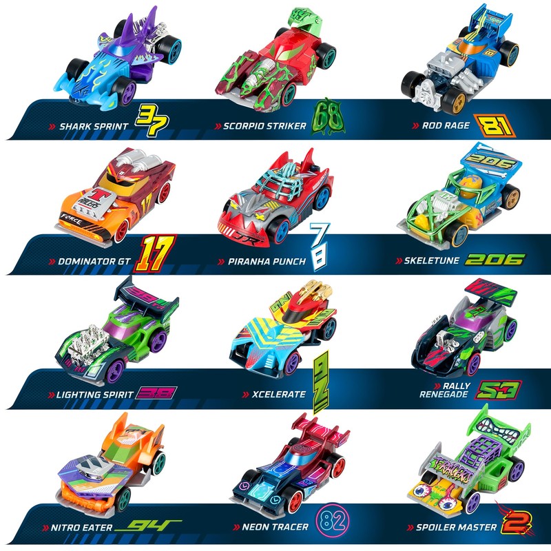 - 24 CARS TO COLLECT – There Are 24 Different Models, Each With Their Own Super Detailed Design. There are 12 in this Collection: Spoiler Master, Dominator GT, Lighting Spirit, Piranha Punch, Scorpio Striker, Rod Rage, Skeletune, Shark Sprint, Nitro-Eater, Xcelerate, Neon Tracer & Rally Renegade