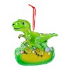 • Features an adorable green dinosaur ornament tangled in Christmas lights; Bottom features a flat green space to write a name or message using a personal pen or marker