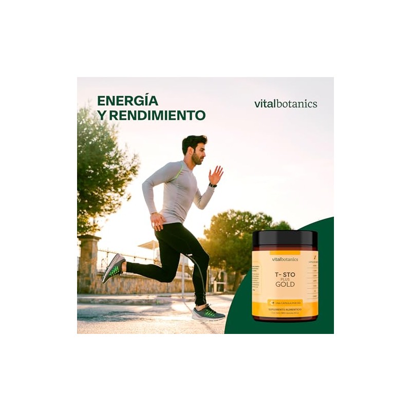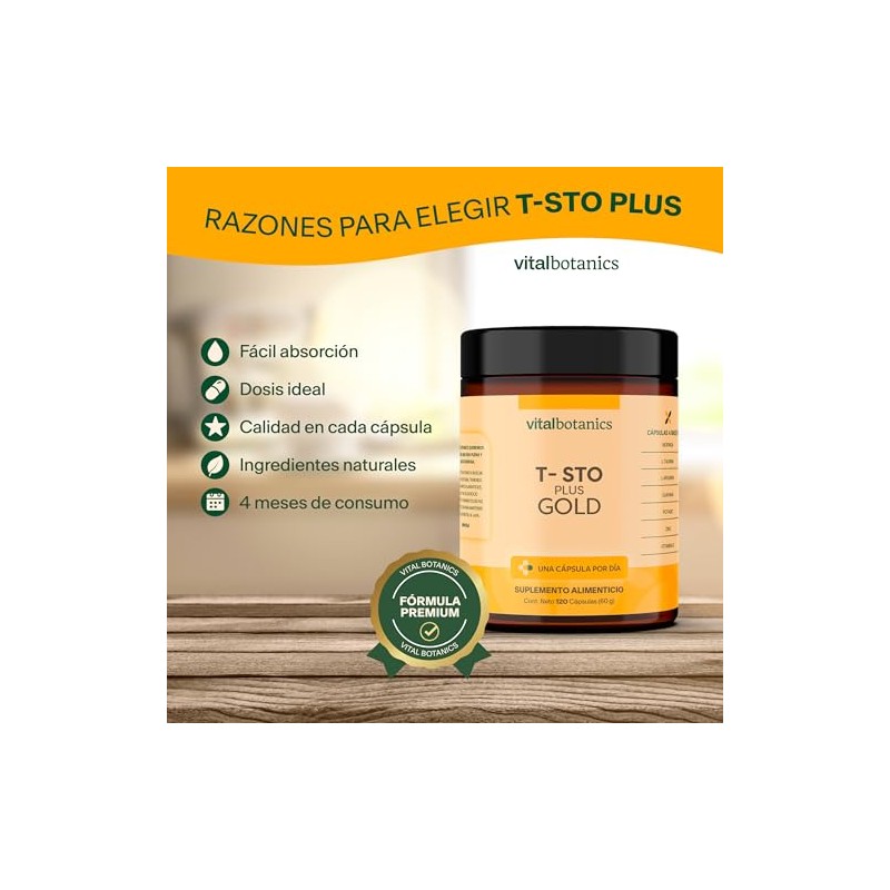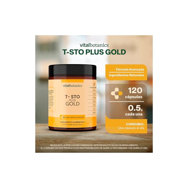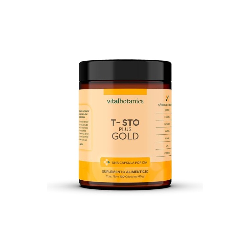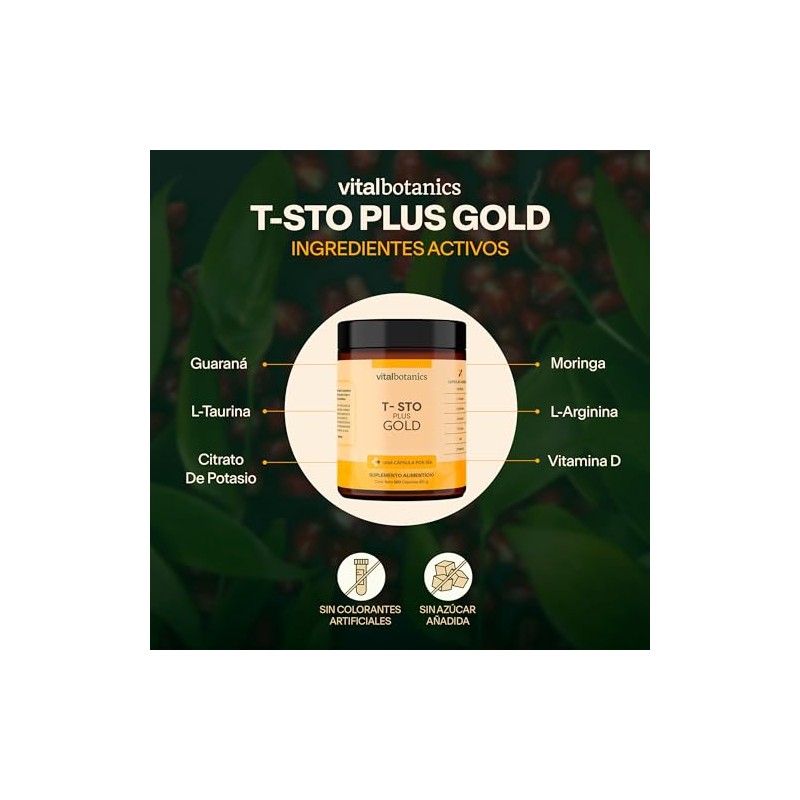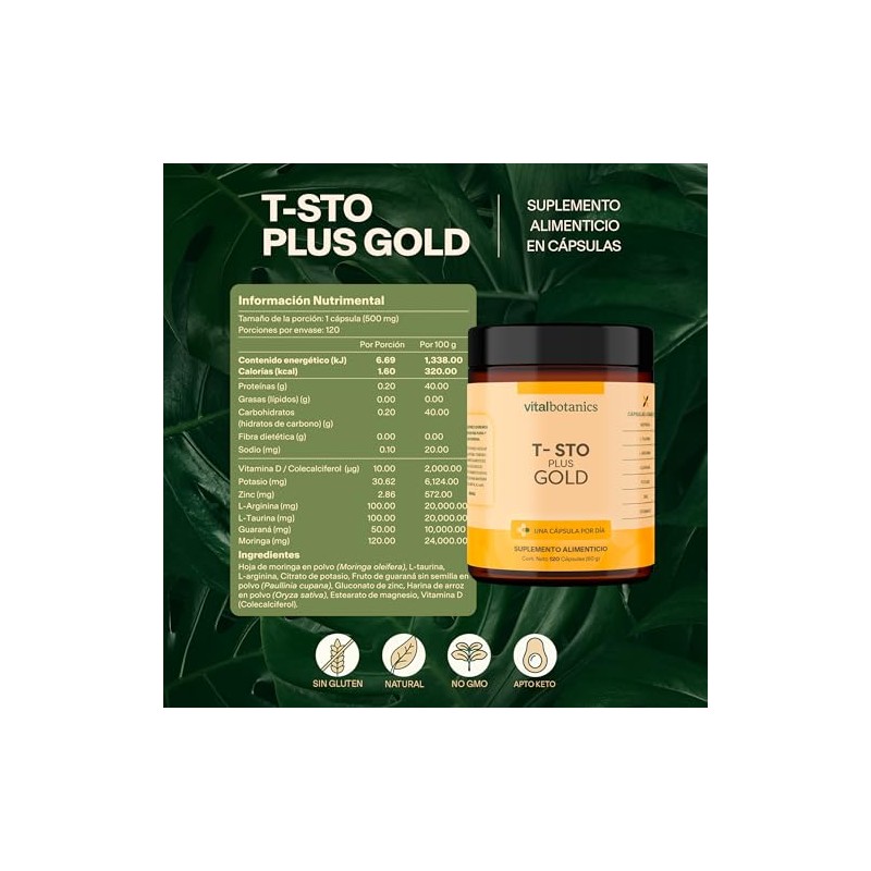🌟 ⭐ T-STO PLUS GOLD Suplemento a base de Vitamina D, Potasio, Zinc, L-Arginina, L-Taurina, Guaraná y Moringa Con 120 capsulas de 500mg. Multivitaminico hombre. Vitaminas para Hombre. Suplementos Alimenticios Libres de Gluten y Apto Keto | VITALBOTANICS ⭐ 🌟