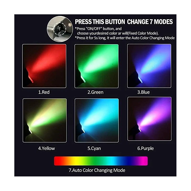 - Press and hold for 5s: Automatic power on and enter the color change mode.