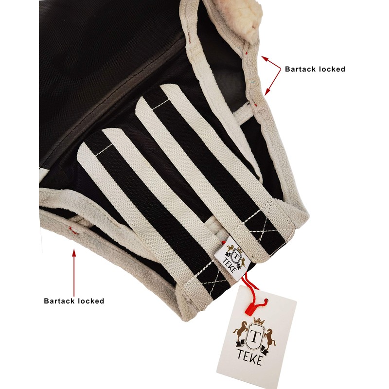 - Elastic binding after ears for automatic shrink to appress horse skin without gaps.