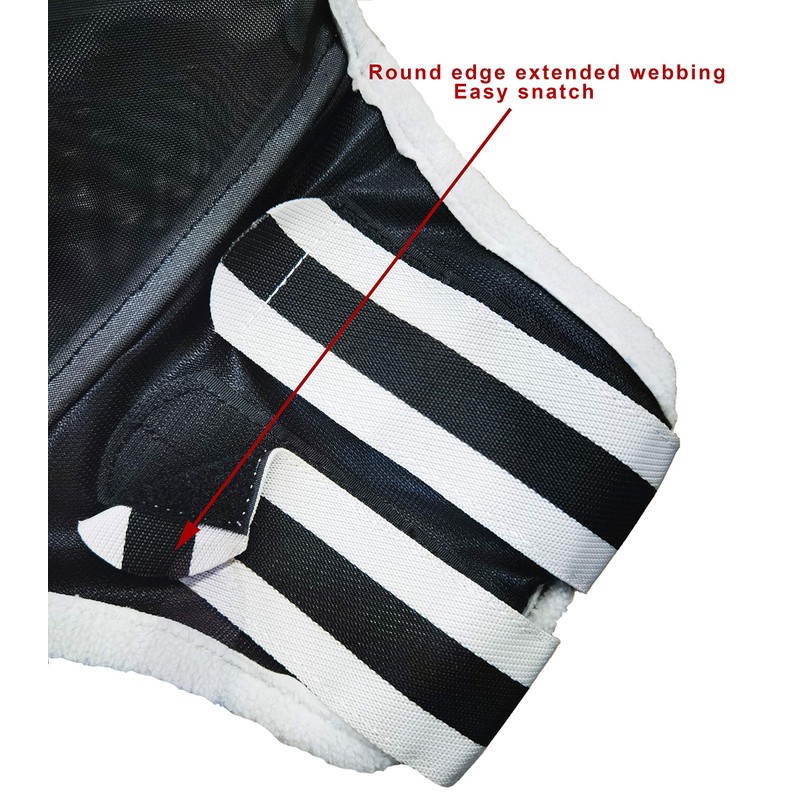 This horse fly mask made of fine mesh with 70%+ UV blocking. Our fine mesh is thicker than the normal mesh in the market, ideal for keep in best shape away from horse eyes. Extra fleece fur cushioned around forehead to keep space between horse eyes and mesh, also for prevent rubbing and chafing. Elastic binding after ears can automatic shrink to fit horse skin without gap. Bartack stitching reinforced around 6 easy tear positions for long lasting.
