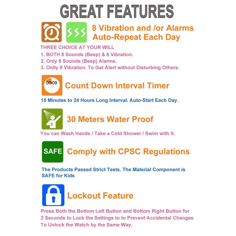 8 alarm and vibration and timer get your child going to the potty on time and regularly. The Urinary Potty Training Watch does the reminding so you don’t have to.