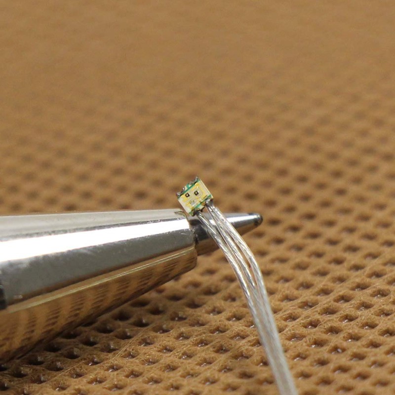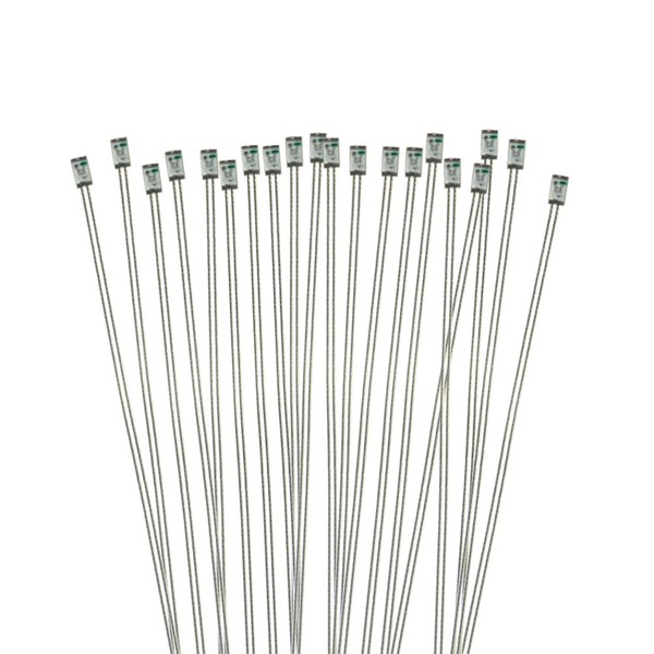 - For the greatest possible miniaturisation, copper wire with only 0.1 mm diameter (cross section 0.008 mm2) is used, wafer-thin and ultra-flexible, but still covered with an electrically insulating clear coat layer. The wire length is approx. 200mm For easy detection of the connection, the cathode is approx. 10mm shorter than the anode.