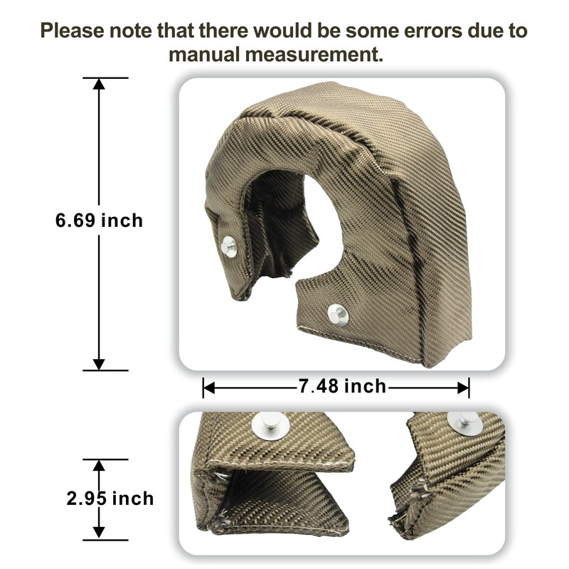- 【High-quality materials】—- T3 turbocharger heat shield cover wrap was made from Double Titanium fiber inside and outside ,the middle layerr of turbo heat shield is made of thickened silica thermal insulation cotton with stainless steel capstan rivets;Size: Height:7",Width: 7",Thickness: 3.5". Tolerance: 1" ceramic.