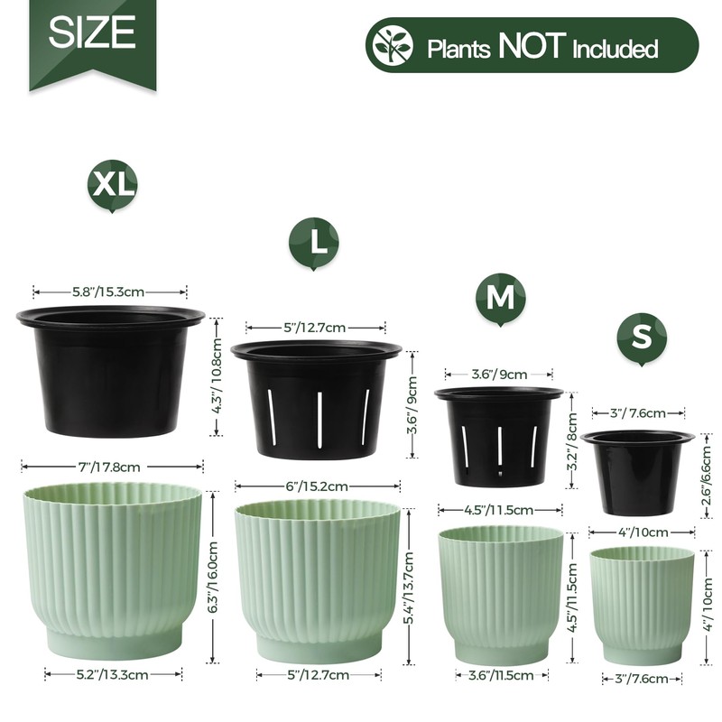 - Box contents: basil pot flower pot green x 4 (diameter 17.8 x 16.1 cm). Plastic flower pots for all types of outdoor and indoor plants: basil, orchid, herbs and so on. Note: The plants shown are NOT included.