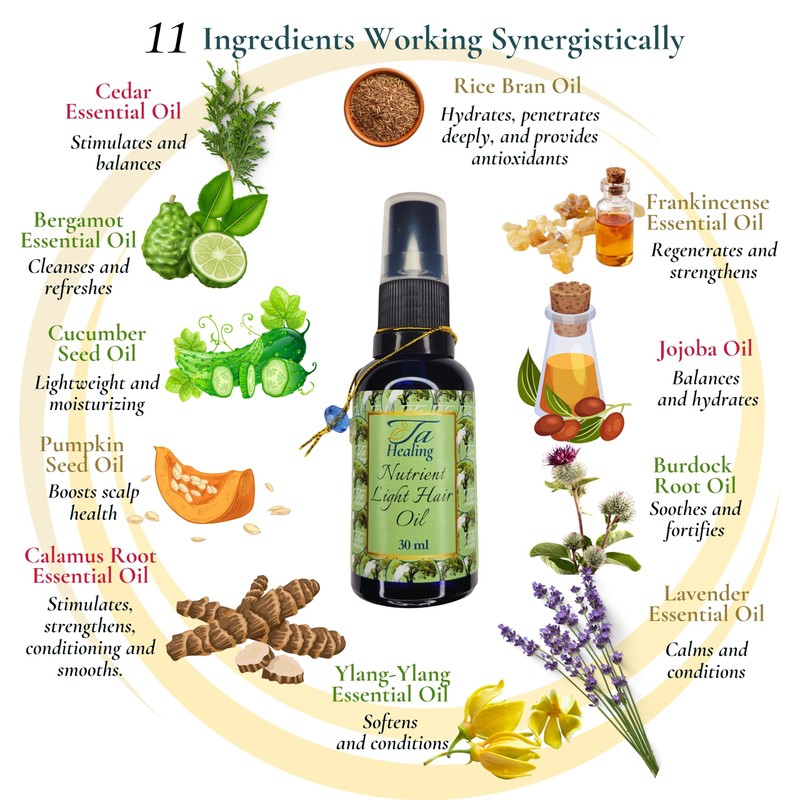 Discover the transformative power of Ta Healing Nutrient Light Hair Oil, a sophisticated blend of 11 natural ingredients working in perfect harmony. This lightweight 30 ml formula features an impressive array of essential oils and botanical extracts, including nourishing rice bran oil, calming lavender, and strengthening frankincense. The fast-absorbing formula deeply penetrates to hydrate and condition while cucumber seed oil provides lightweight moisturization. Pumpkin seed oil promotes scalp health, while burdock root oil soothes and fortifies. The unique combination of cedar, bergamot, and ylang-ylang essential oils creates a balanced, natural fragrance while contributing their therapeutic properties. Perfect for all hair types, this non-weighing formula smooths strands, reduces frizz, and adds a polished finish. The double-sealed bottle ensures product freshness and optimal performance. Made in Canada, this natural hair oil brings together centuries of botanical wisdom in one elegant solution for healthier, more manageable hair.