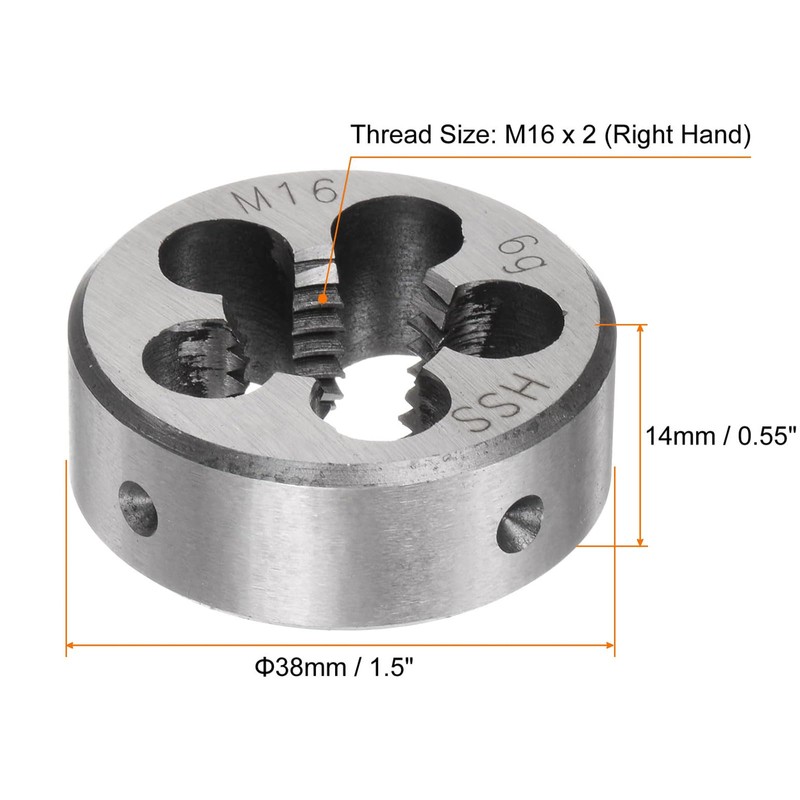 - [Size and package] right hand; thread size: M16 x 2mm; outside diameter (OD): 33mm / 9" (Adjustable); thickness: 17.5mm / 8.37"; Package includes 1pc metric adjustable round die.