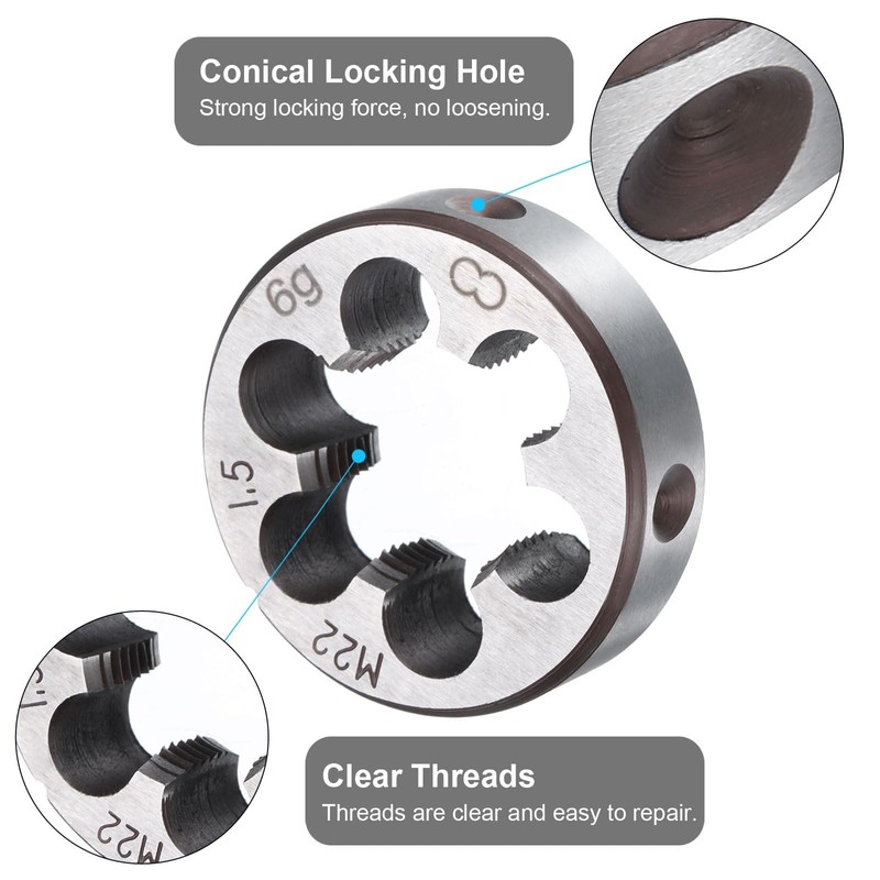 - [Size and package] thread size: M22 x 1.5mm; outside diameter (OD): 82mm / 58" (Adjustable); thickness: 66.5mm / 57.37"; Package includes 1pc metric adjustable round die.