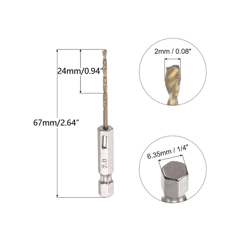 - 【Specification】Shank: 1/4-inch Hex; Drill Diameter: 2mm / 0.08-inch; Total Length: 67mm / 2.64-inch; Drill Bit Length: 24mm / 0.94-inch; 1 x Twist Drill Bits.