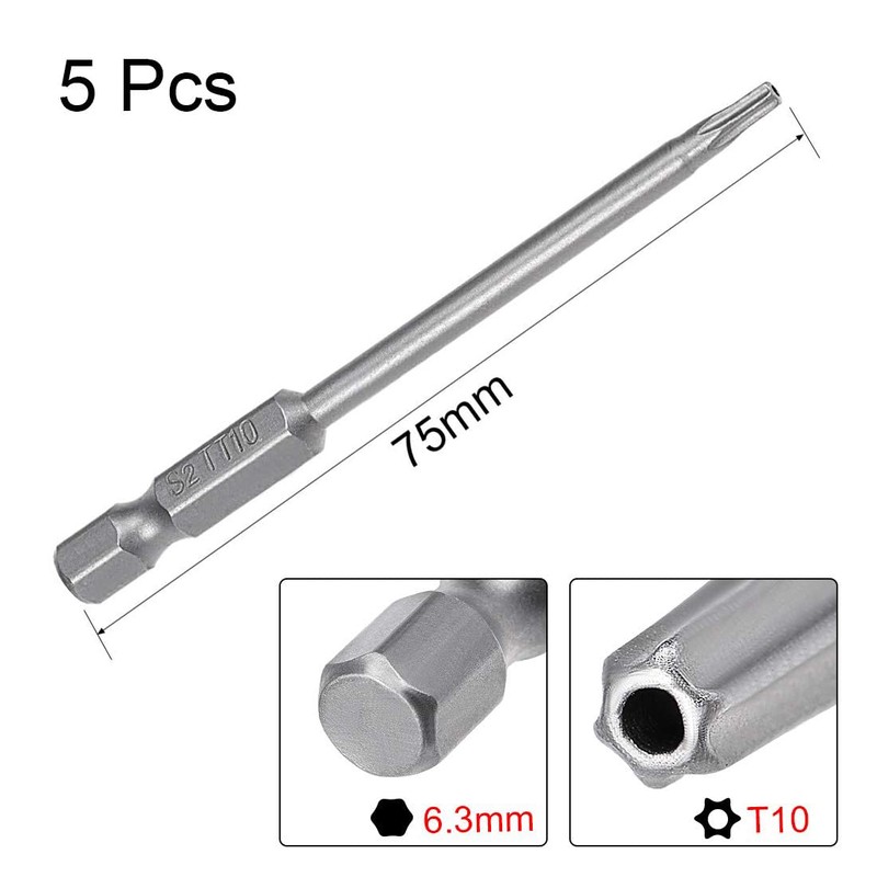 This T10 tamper-proof Torx bit is an essential tool for both professional tradespeople and DIY enthusiasts. Manufactured from high-quality S2 steel, it delivers outstanding durability and wear resistance, ensuring a longer service life even under frequent or heavy-duty use. The 75mm long shaft provides extended reach for fasteners in deep or narrow spaces, while the 1/4-inch hex shank ensures compatibility with most cordless drills, impact drivers, and screwdrivers.