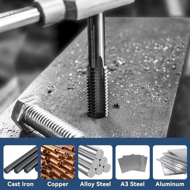 • Versatile: taps create new threads or re-thread damaged or jammed threads. Widely used for most metals, iron plate, copper, zinc, alloy steel, abrasive steel, A3 steel, stainless steel. Add proper thread oil to get higher quality threads and more durable faucets