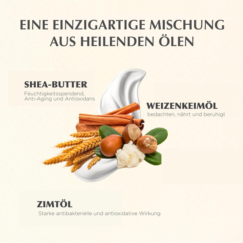 • 95% ingredients of natural origin, synergy of active ingredients: shea butter, wheat germ oil, cinnamon oil, aloe vera, sweet almond oil