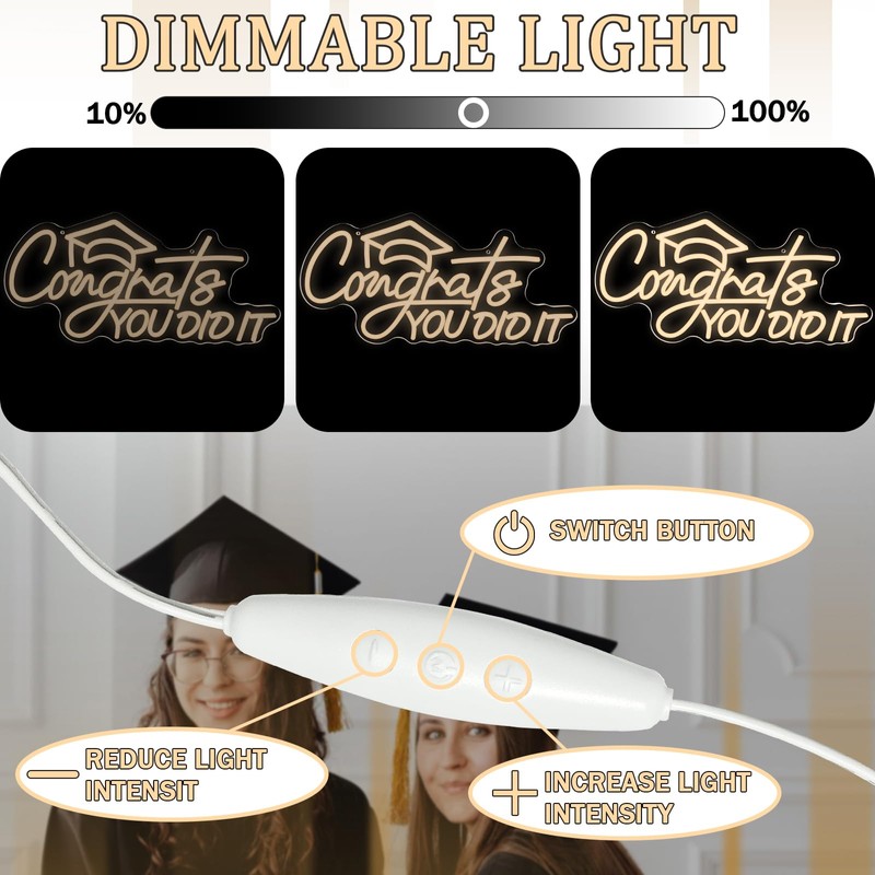 • Adjustable Lighting: Our neon lettering of graduation caps has 5 gear brightness adjustable, just by pressing the + or - button to get the lighting effect you want, creating a romantic and warm atmosphere for your graduation ceremony