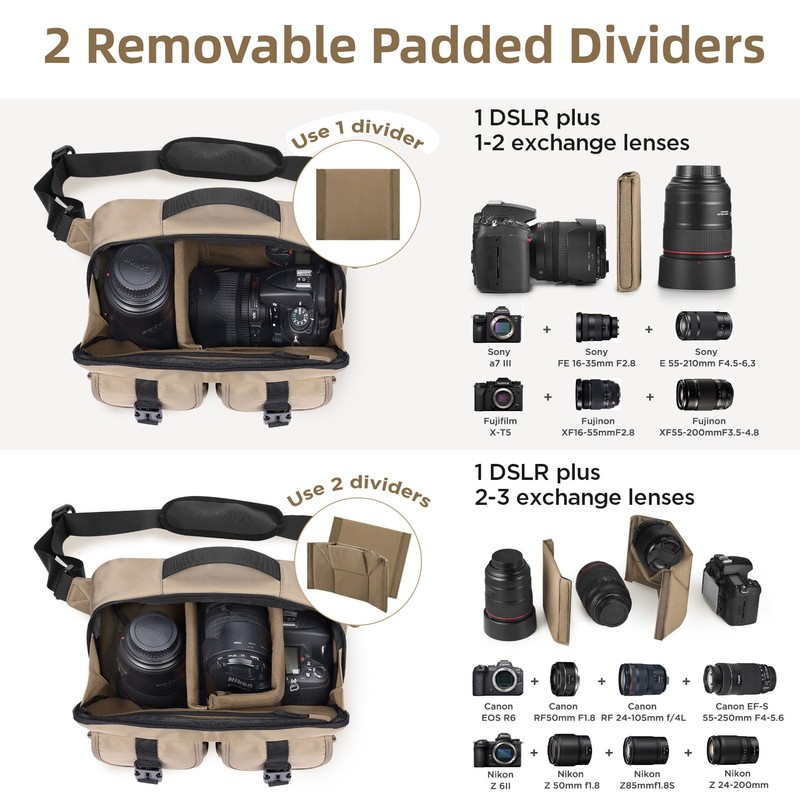 - 【Removable Dividers】2 removable dividers to organize the space to suit your needs and set it up to hold 1 DSLR or mirrorless camera plus 2-3 exchange lenses