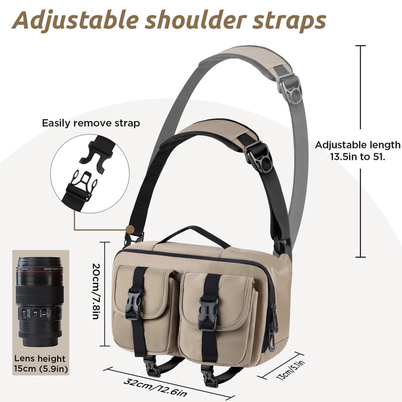 - 【Versatilit】Padded shoulder strap varied from 13.5 to maximum 51.1 inch can be adjusted personal preference.It can be a crossbody camera bag for women and men, and can be used as a fanny pack or a everyday shoulder bag(removing inner dividers)
