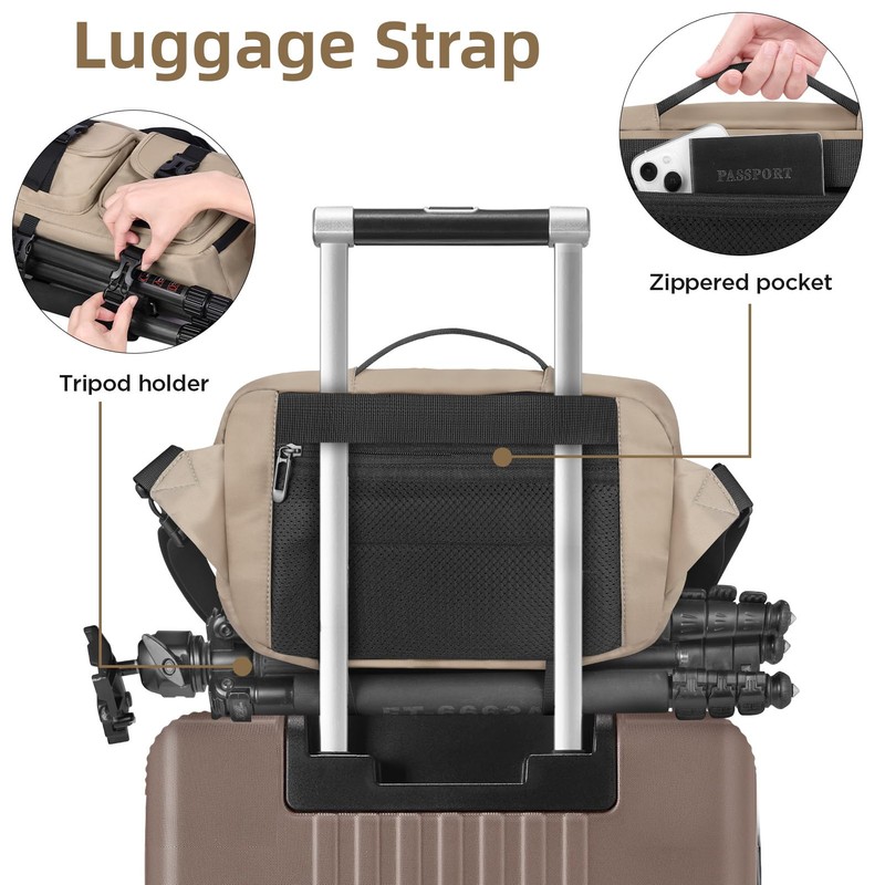 - 【Tripod Holder&Luggage Strap】A smart strap located on the bottom of the bag allows you to carry a compact tripod or a selfie pole.The trolley strap at the back for attaching your suitcase while traveling to free your hands