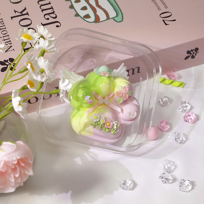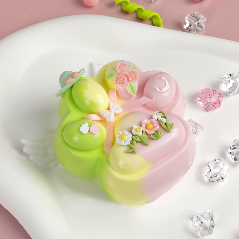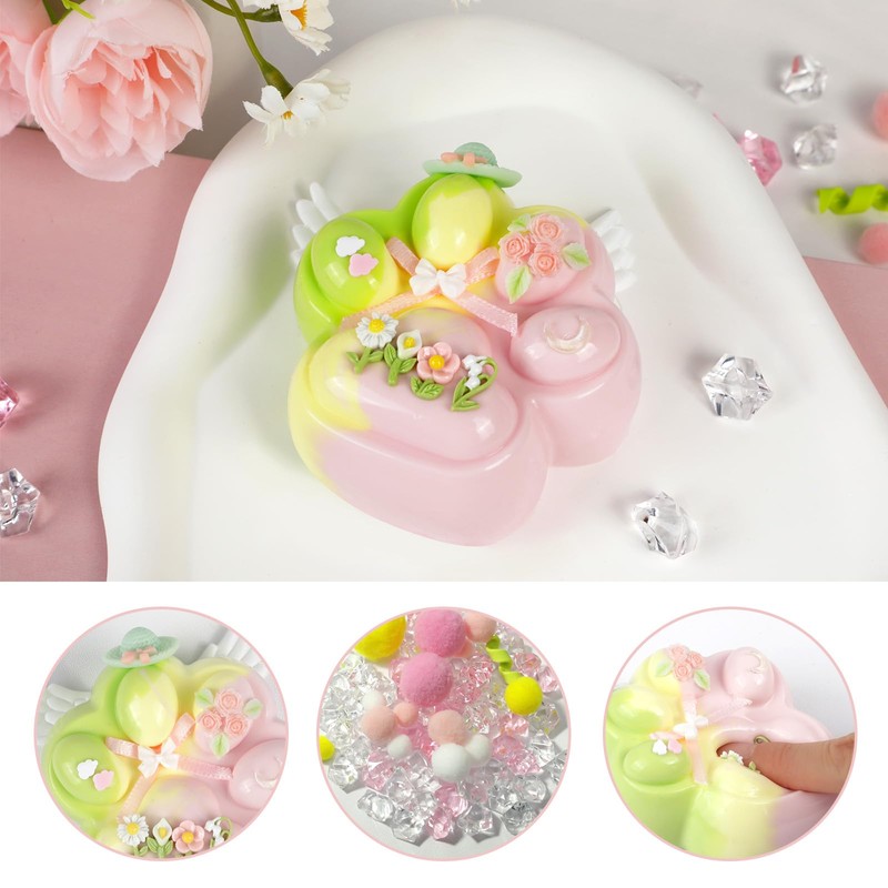 - Spring-Inspired Gradient Cat Paw Design: Featuring a charming cat paw shape in a green-to-pink gradient, this squishy toy is decorated with colorful flowers, bows, and elegant white wings.