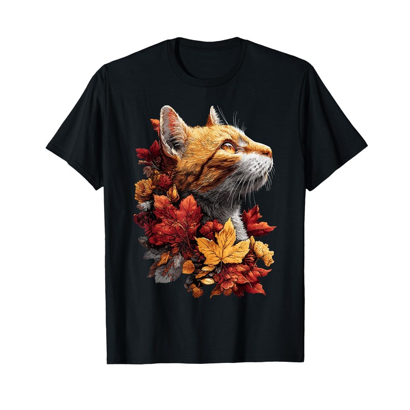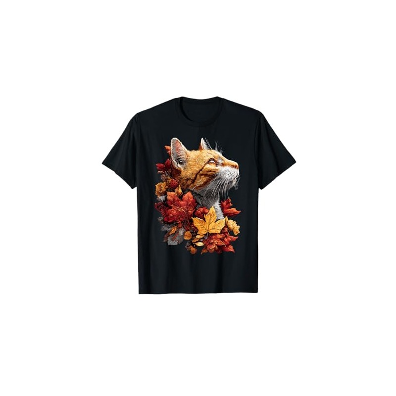 Tabby Cat with Autumn Leaves Fall Flowers Feline Animal T-Shirt