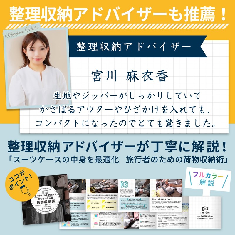 - Recommended by Organization Storage Advisor: Recommended by Mai Miyagawa, "This product is very surprised because the fabric and zippers are sturdy and compact enough to hold bulky outerwear and throw blankets. It also comes with a luggage storage method to optimize the contents of your suitcase supervised by Organization and Storage Advisor
