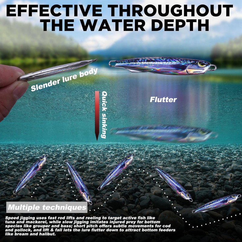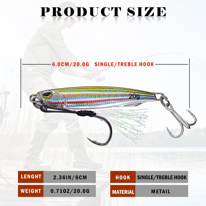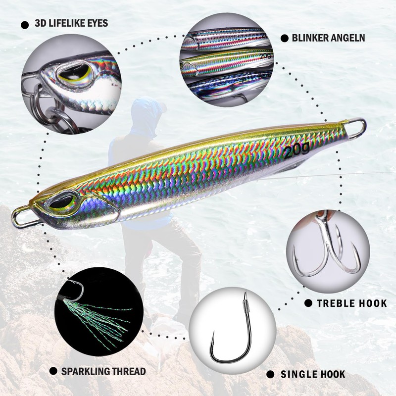 - 【Glänzende Beschichtung】 Der schillernde lasergeflaschte vertikale angelköder salzwasser reflektiert sonnenlicht in einem 360° winkel und erzeugt deutliche lichtblitze, ideal für dunkle gewässer und schwache lichtverhältnisse. die hochwertige verarbeitung sorgt für eine ausgezeichnete abriebfestigkeit der beschichtung.