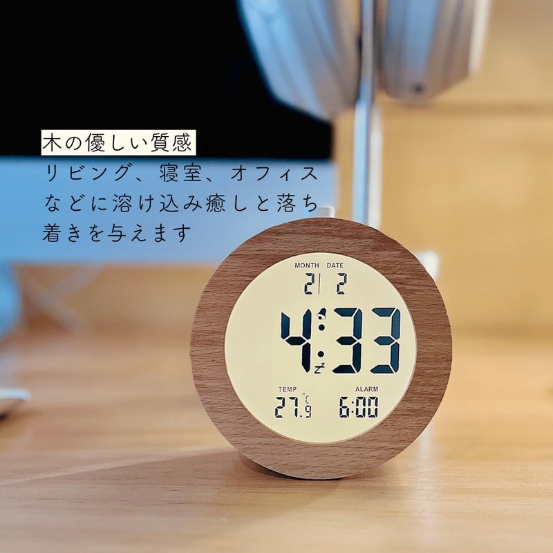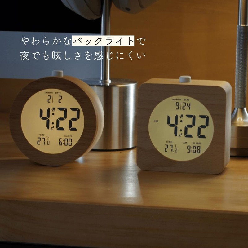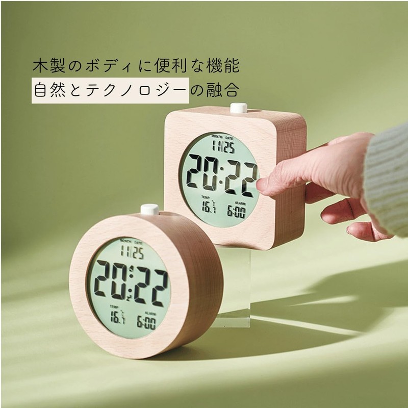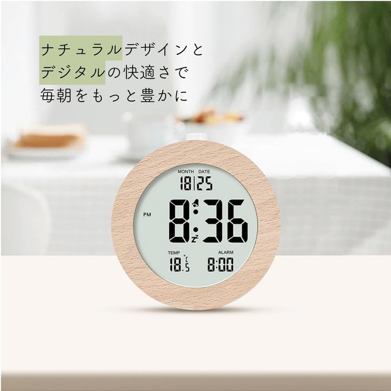 Table Clock, Alarm Clock, Digital Clock, Wooden, Natural Calendar, Temperature Display, Cute, Round, Square, Bedside, Bedroom, Quiet (Round)
