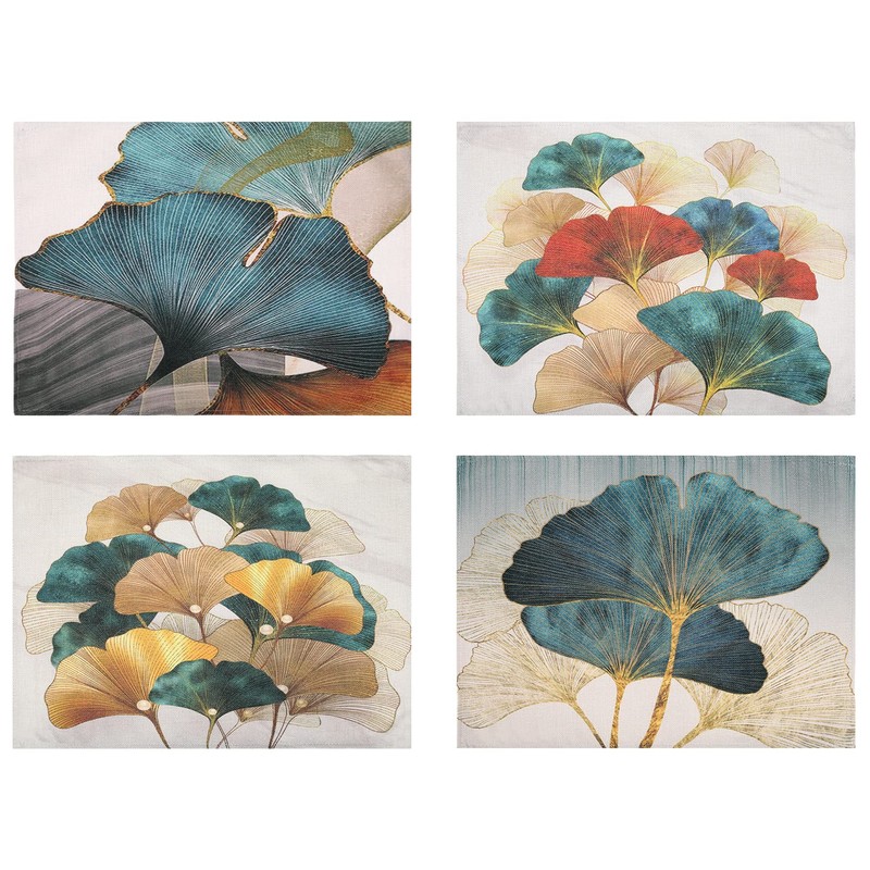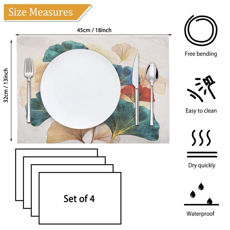 - Retro fall leaves: prevent your table from getting stained. It can also make your dining environment more comfortable. Printed with green and gold ginkga patterns, the print on is very clear and vibrant. The colours are very rich and vibrant. This beautiful placemats will add freshness and vitality to your cozy home and win the impression of your guests.